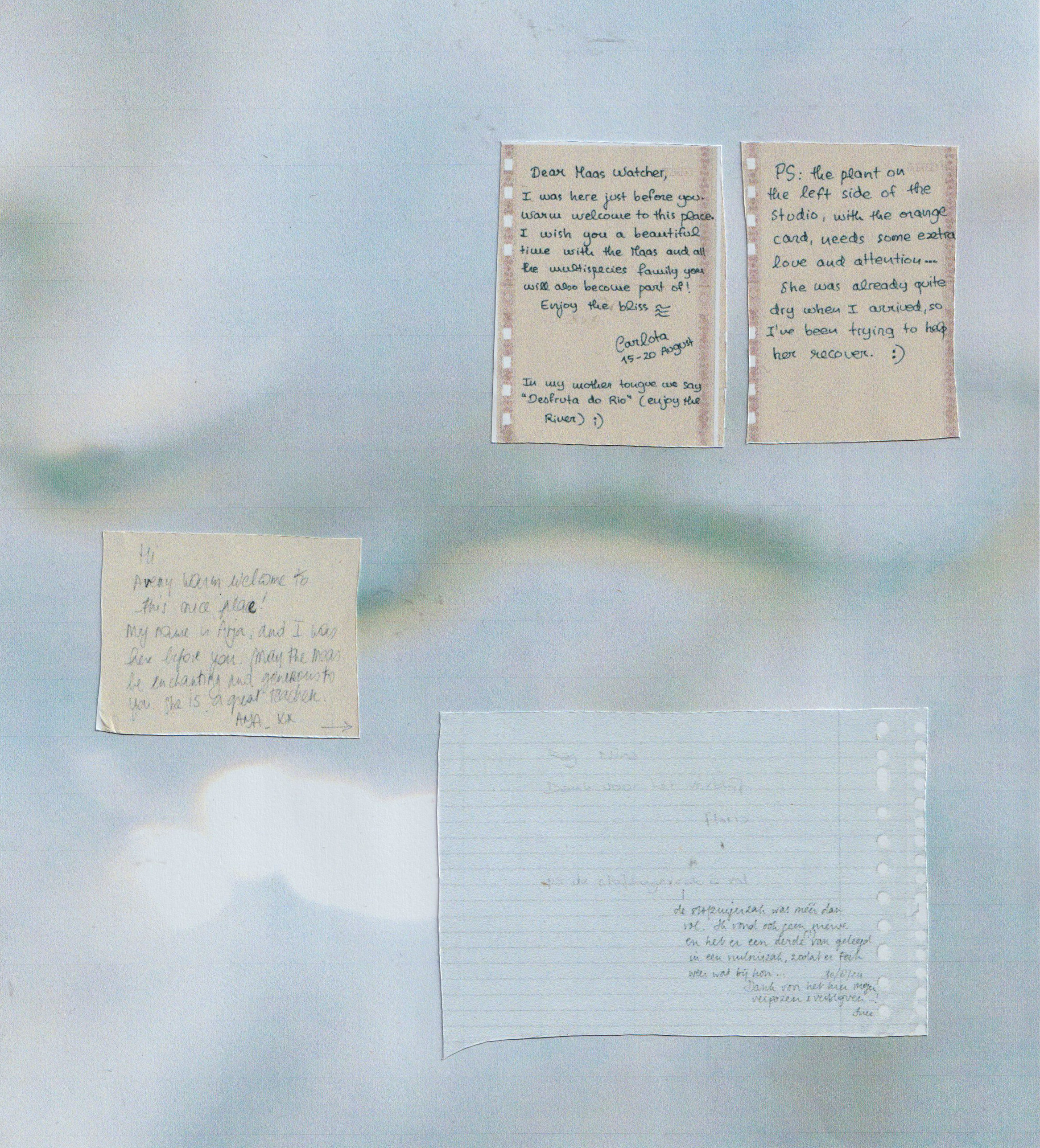 In the end of 2024, I was commissioned by SoAP and TAAT to design a book made from visual archives of the maas lab. A maas book. I stayed with the maas for a residency in situ collecting traces from past residents, curating images from the previous year and setting up a blueprint of the book. This analog process evolved at the rhythm of my small printer that I brought by the river with me, as I was selecting, printing and laying out snippets of the maas lab. The pixels got washed out through a mix of ink and water, onto paper, conferring a certain harmony and atmosphere to the book. A handwritten narration guides us through the river flows.