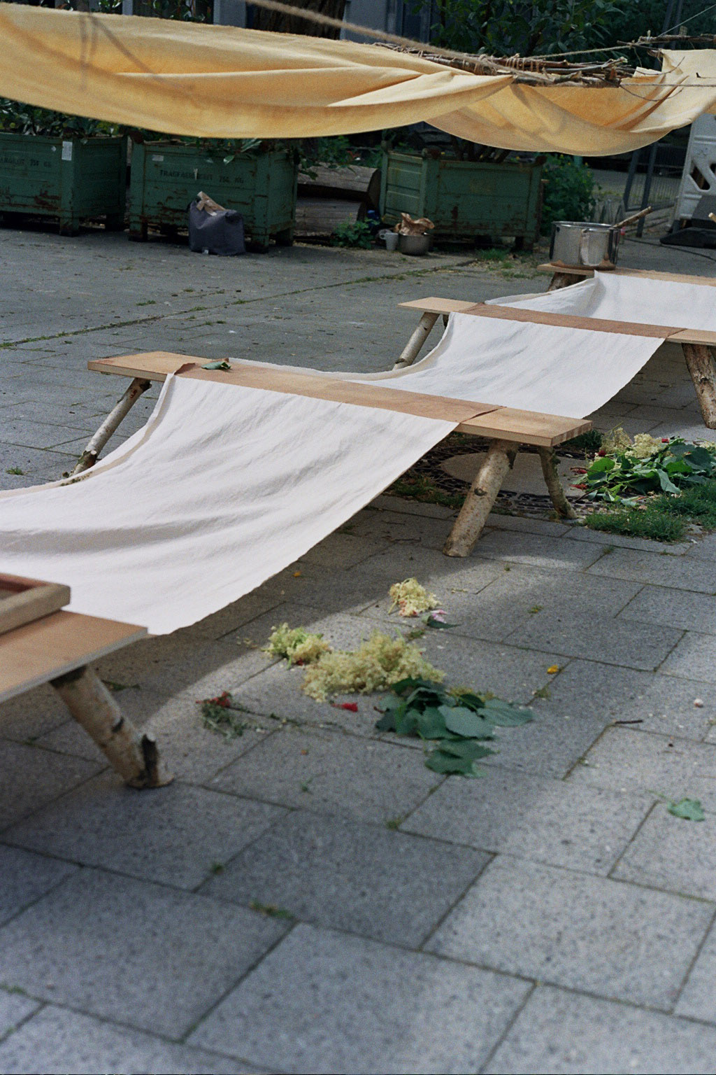 Digging into the roots of this interaction with the birch tree, this project intends to propose contemporary interpretations of the May Tree tradition. A group of international students from the Köln International School of Design investigated vernacular uses of the birch tree that can be celebrated at the end of May. Recycling the cut MaiBäume of the defeated lovers in the city, they explored old crafts such as making paper from the bark, making drinks from the sap or dyeing fabrics from birch trees. They designed rituals for the spring that are in line with the values of our time : circular thinking, local sourcing and gender fluidity. At the end of the week, the group demonstrated their creations in the courtyard of the school, in a festive celebration of love and spring, under the colors of the birch tree.