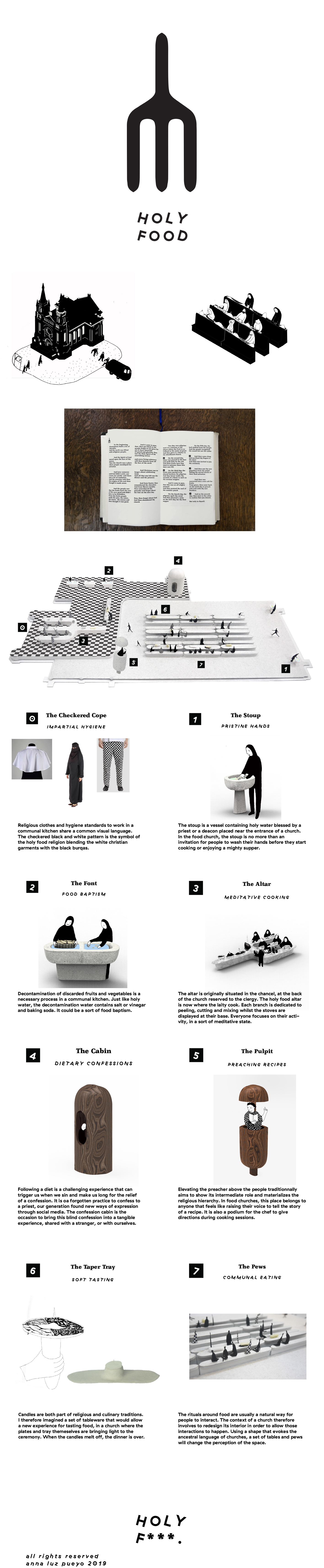 By redesigning the experience of the church and the use that we make of ancient artefacts, I propose to turn those abandoned places into community kitchens. The church becomes a space for civic action and communal moments, where they are kept non-commercial and inclusive, in their silence and majesty. Different rituals and ceremonies are shaped around this movement, leading society to unite through food. With this proposal, I intend to question what we are seeking through faith, and the way we can bring back the values that are common to all religions that tend to be forgotten.