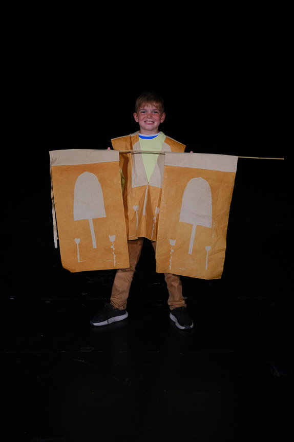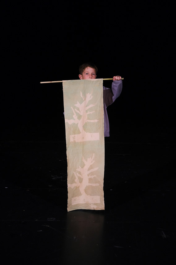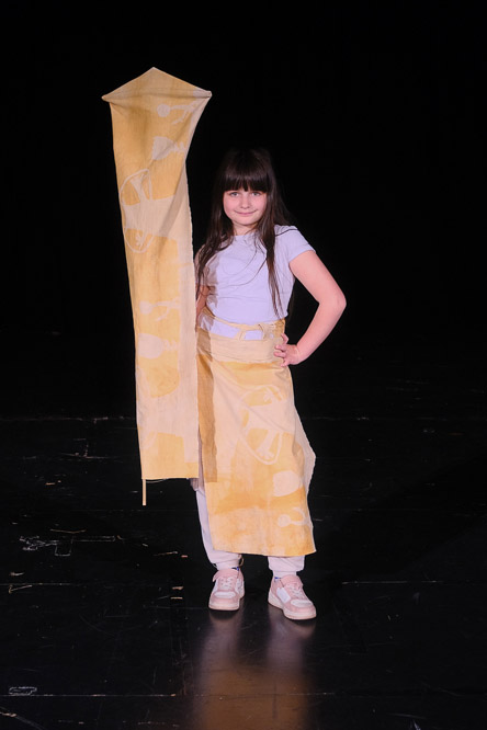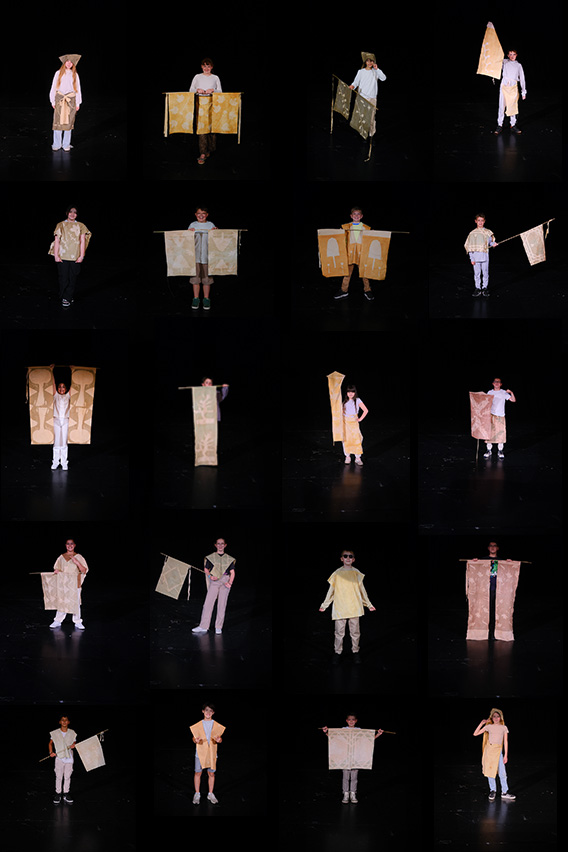 À un âge charnière entre l’enfance et l’adolescence, l’habit m’est apparu comme un médium fascinant, qui cristallise des personnalités, des envies et des prises de position. Nous avons travaillé à partir de deux rectangles de coton ouverts aux interprétations : un tablier parfois devenu jupe, un poncho qui se transforme en veston, un drapeau prolongé en bannière, un bonnet d’âne qui se prend pour une traîne.