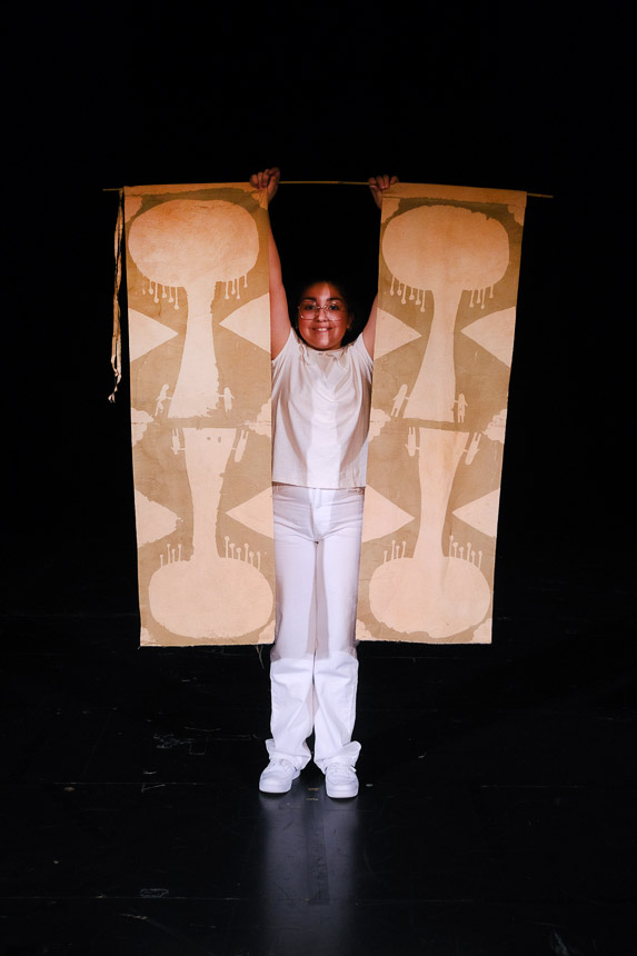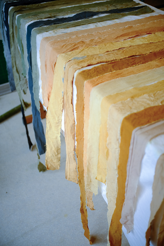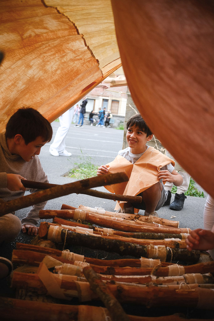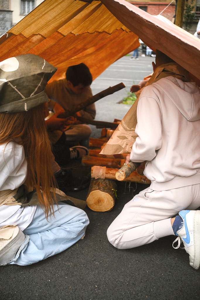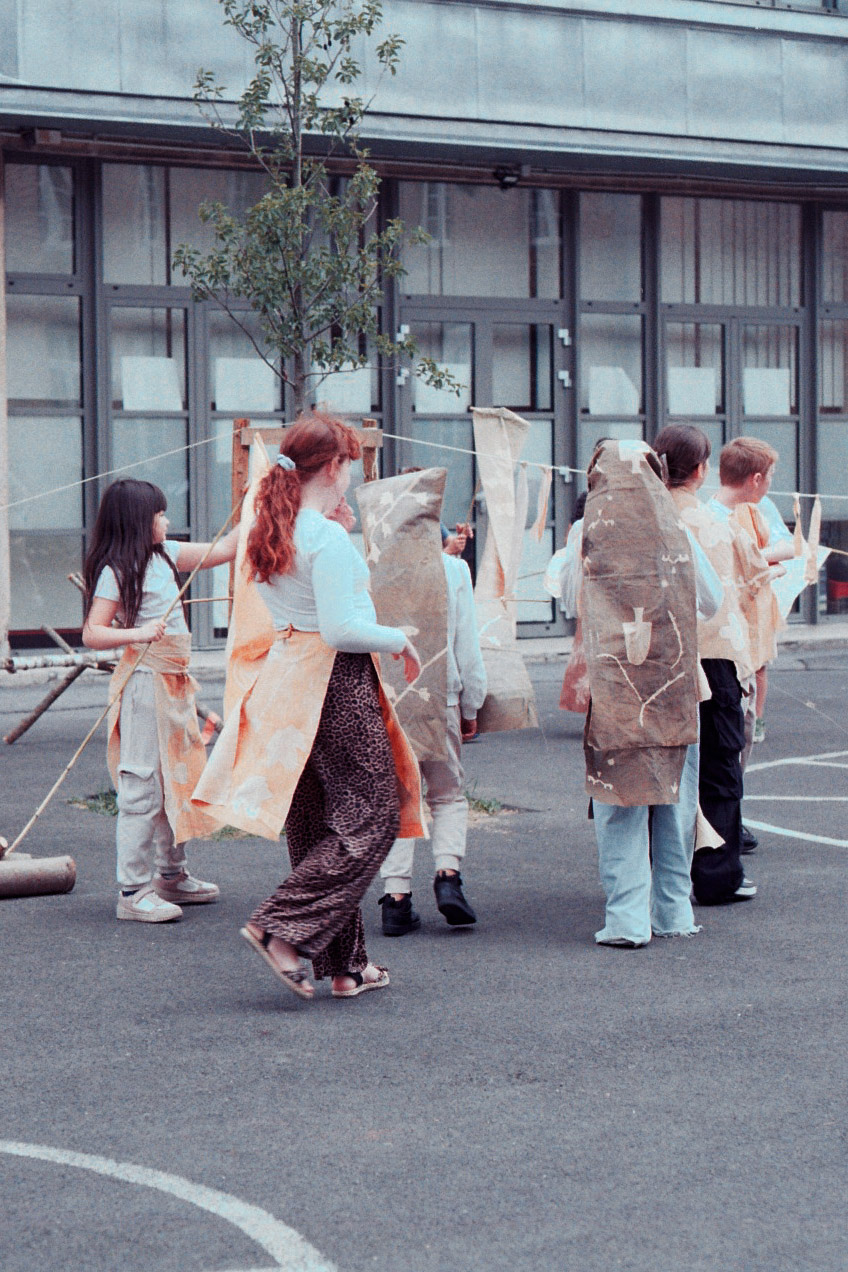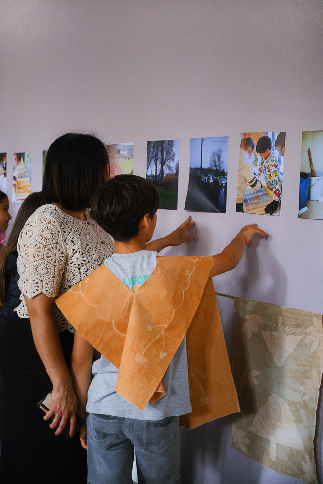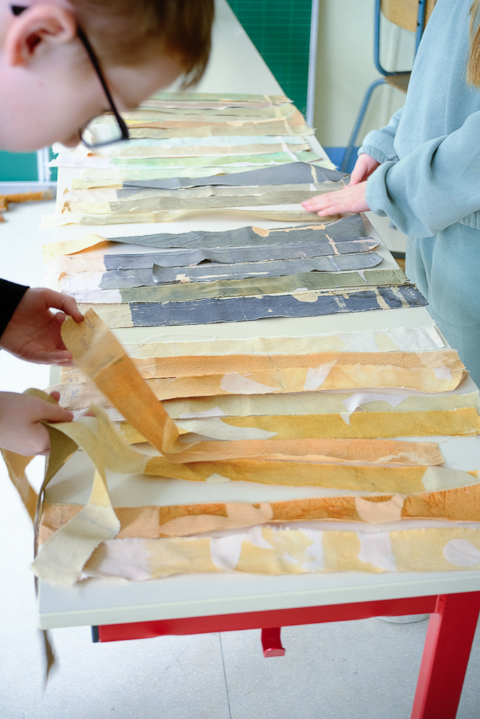Avec le reste des tissus teints et les branches écorcées, ils ont prolongé l’atelier et tendu une grande tente abritant un xylophone géant. Cette résidence m’a permis d’approfondir ma recherche sur le lien qui unit les enfants aux plantes, et la manière dont l’artisanat peut s’intégrer à leur quotidien.