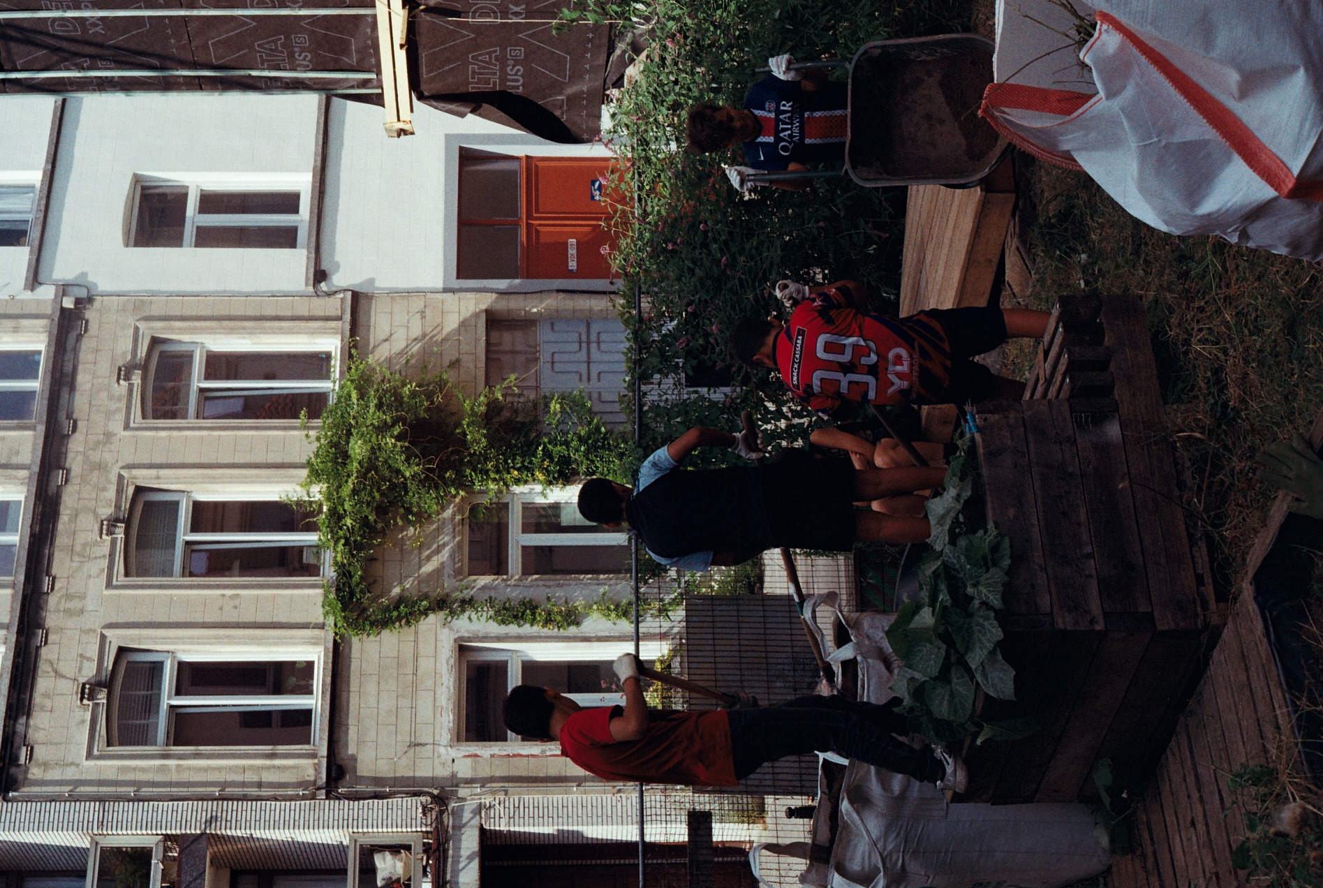 Cette initiative prend la forme d’une occupation de deux ans, qui vise à transformer la friche en espace de rencontres inter-culturelles, de culture de plantes comestibles et de loisirs pour les enfants du quartier. L’année est rythmée par des temps forts, où le jardin est en chantier participatif pour y construire les infrastructures : des buttes, une mare, une citerne, une boîte à outils, une nouvelle grille, une serre, un rocket stove… Le reste du temps, des permanences le lundi permettent aux habitant.e.s de venir profiter du jardin, de récolter des herbes et légumes, d’organiser un barbecue ou de discuter entre voisins.